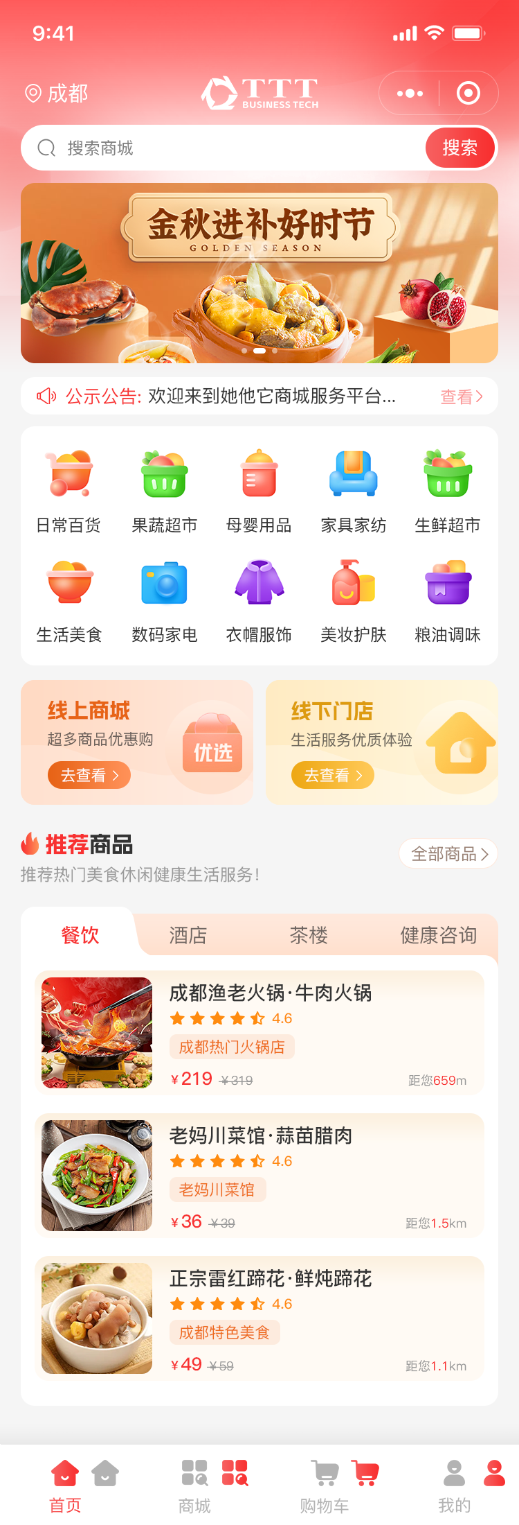 此小程序分为线上商城和线下点餐,线上商城分类多种话如:宠物专区,化妆品,家用家电等。