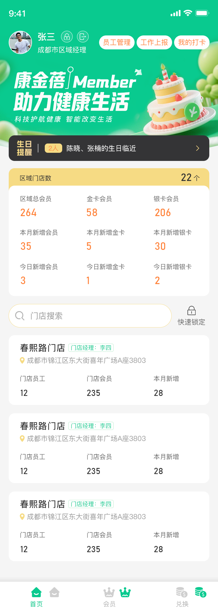 数据统计/同等级会员分别数量区域门店会员总数/域门店本月新增会员数不同等级会员分别数量/域今日新增会员数不同等级会员分别数量/日提醒会员生日提前一天及当天做生日提醒员工/选区域筛选门店