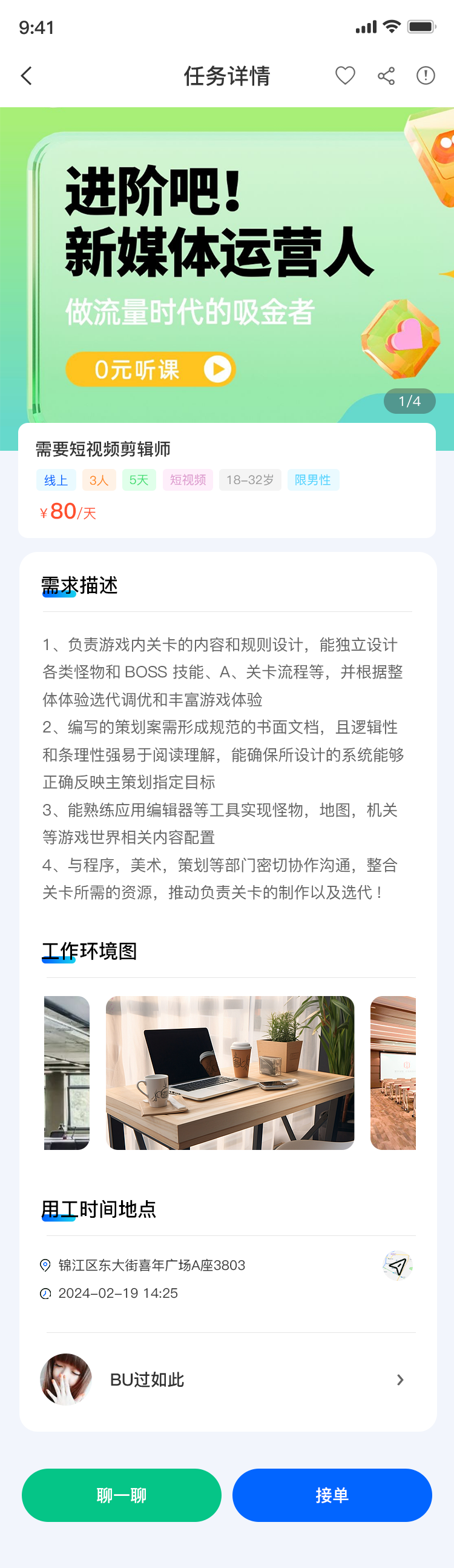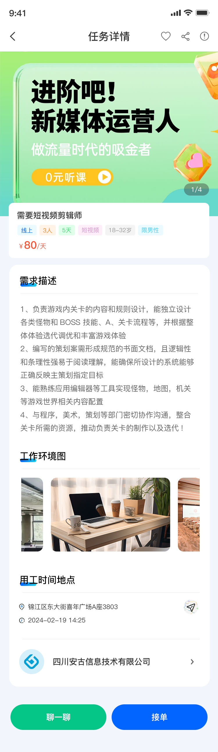 信息详情:1.名称:(客户编辑的名称)|类型2.金额3.用工要求:人数、性别、描述4.标签5.用工时间:开始时间、结束时间6.用工地点(文字信息+地图信息)7.环境图(用户上传的图片)