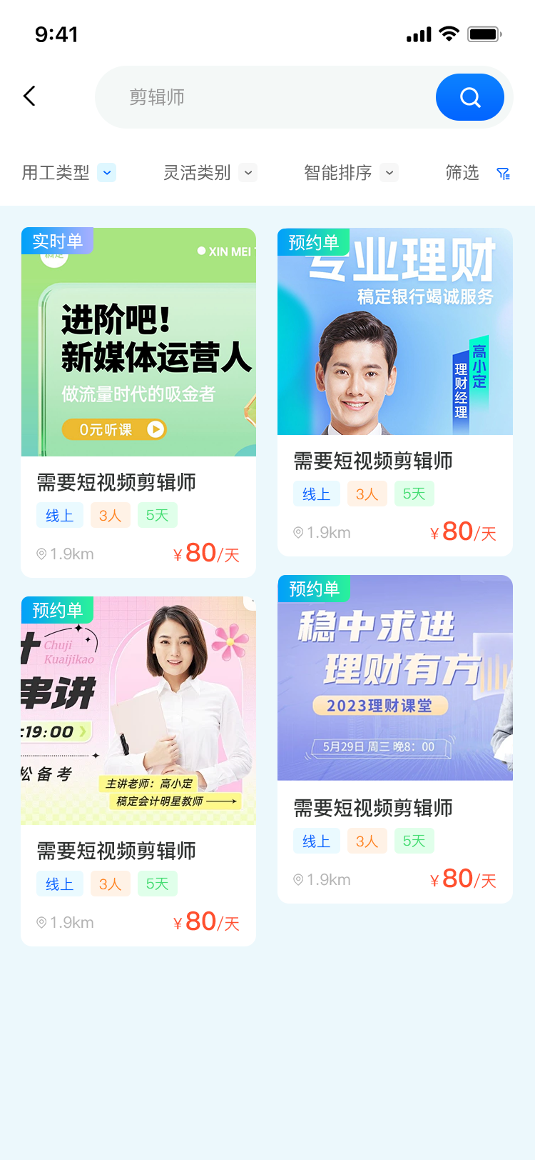 找活干(找活人员):1.瀑布流形式展示找人干活的项目图片(雇主上传的图片、如没有上传设置平台默认图片)名称:(客户编辑的名字)|类型开工时间要求标签雇主信息:头像、名称位置:定位名称|距离、价格加急项目右上角印章形式展示、2.点击进入详细界面3.接受任务(弹出平台协议进行确认)
