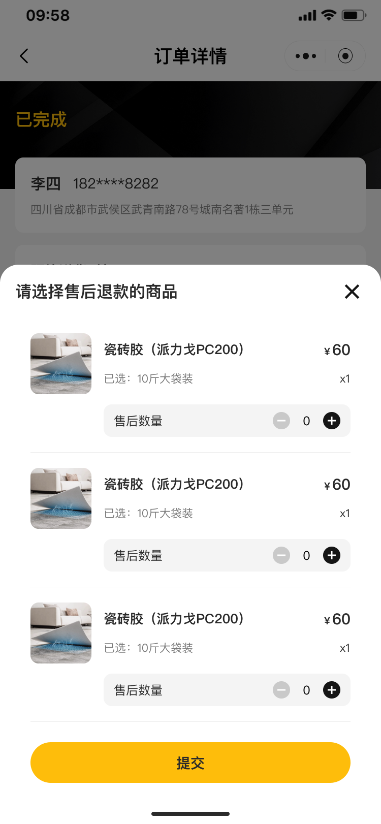1.用户端选择产品进行下单输入对应楼层进行下单,查看设计师的案例。用户可创建草稿单查看司机端设置的欠货单,以及售后单的申请查看。