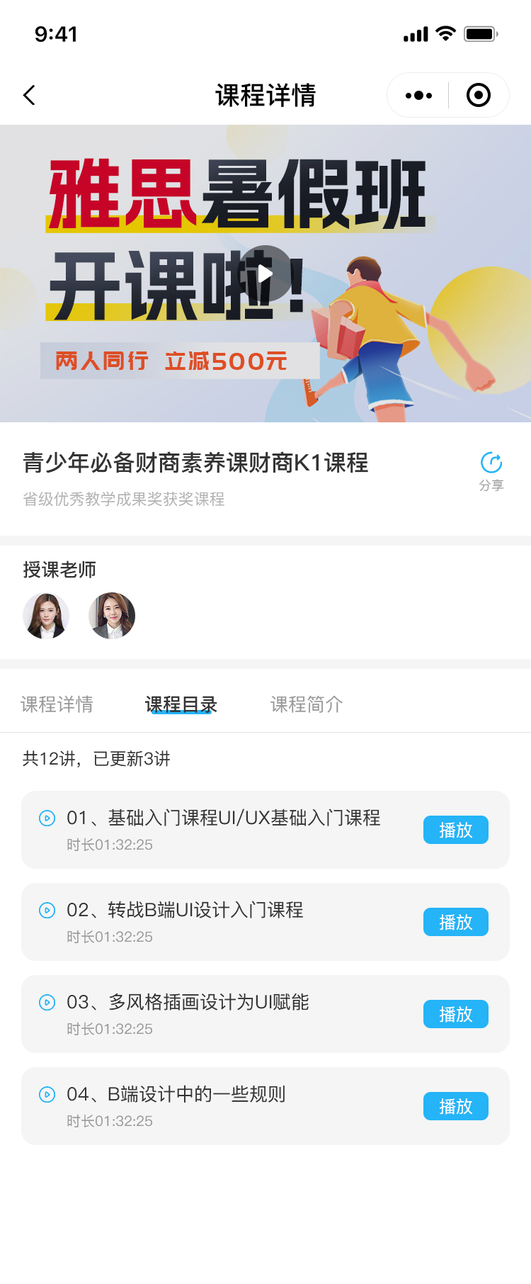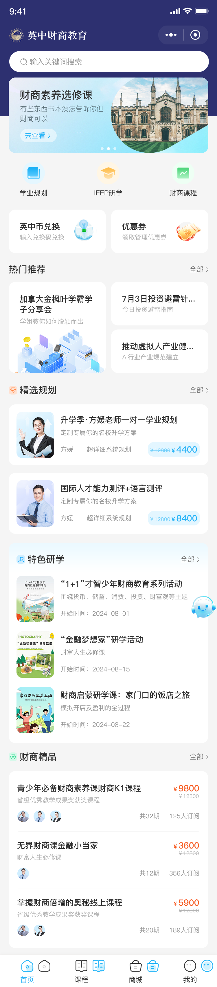 端口:小程序首页:学业规划,IFEP研学,财商课程三大分类点击进入分别是对应的课程分类可进行报名,对应的课程可进行查看对应的视频讲解试看和缴费查看。商城板块可线下培训的时候获得英中币的兑换券,用户在小程序上进行英中币的兑换到小程序账户里并在商城中兑换产品,也可以直接进行购买使用优惠券进行抵扣。针对小程序用户还可以设置老师的身份就可以看到老师下面的下级用户。