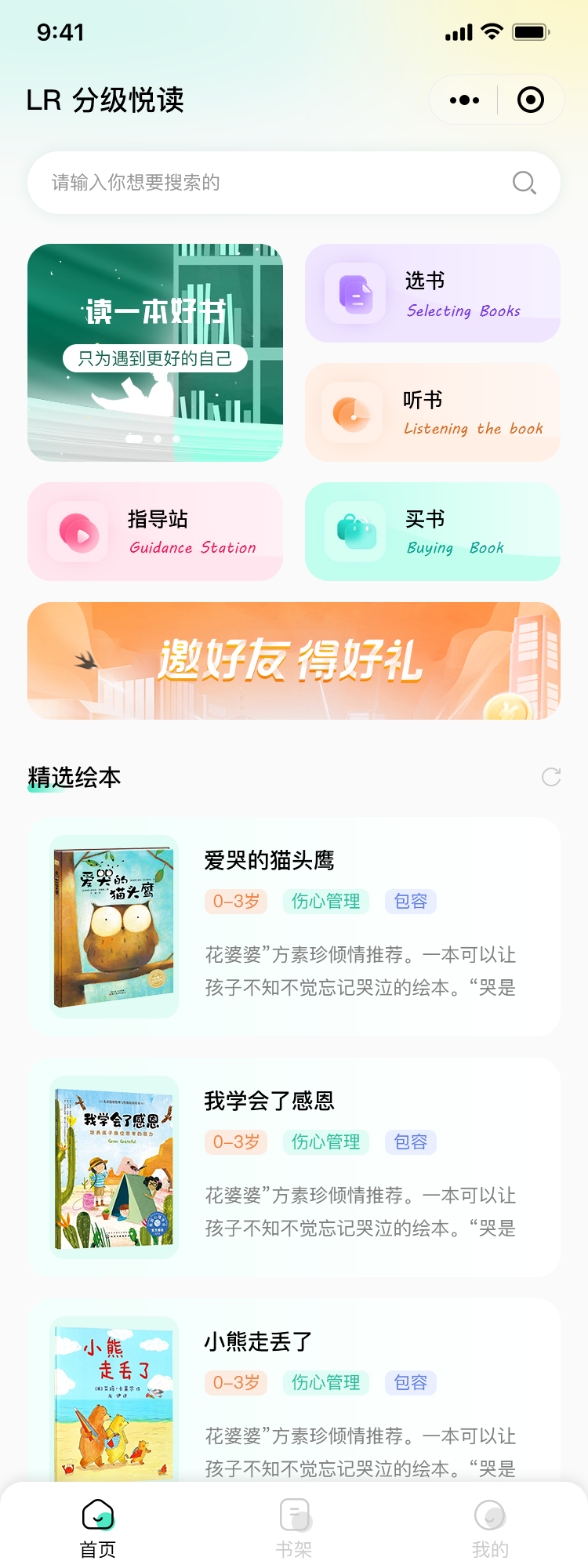 Banner图3-5张轮播图、搜索一可精准、模糊查询、帮娃选绘本、煊彤绘本馆、主要功能板块、每日睡前听阅读指导站、推广活动、搜素精准或模糊搜索