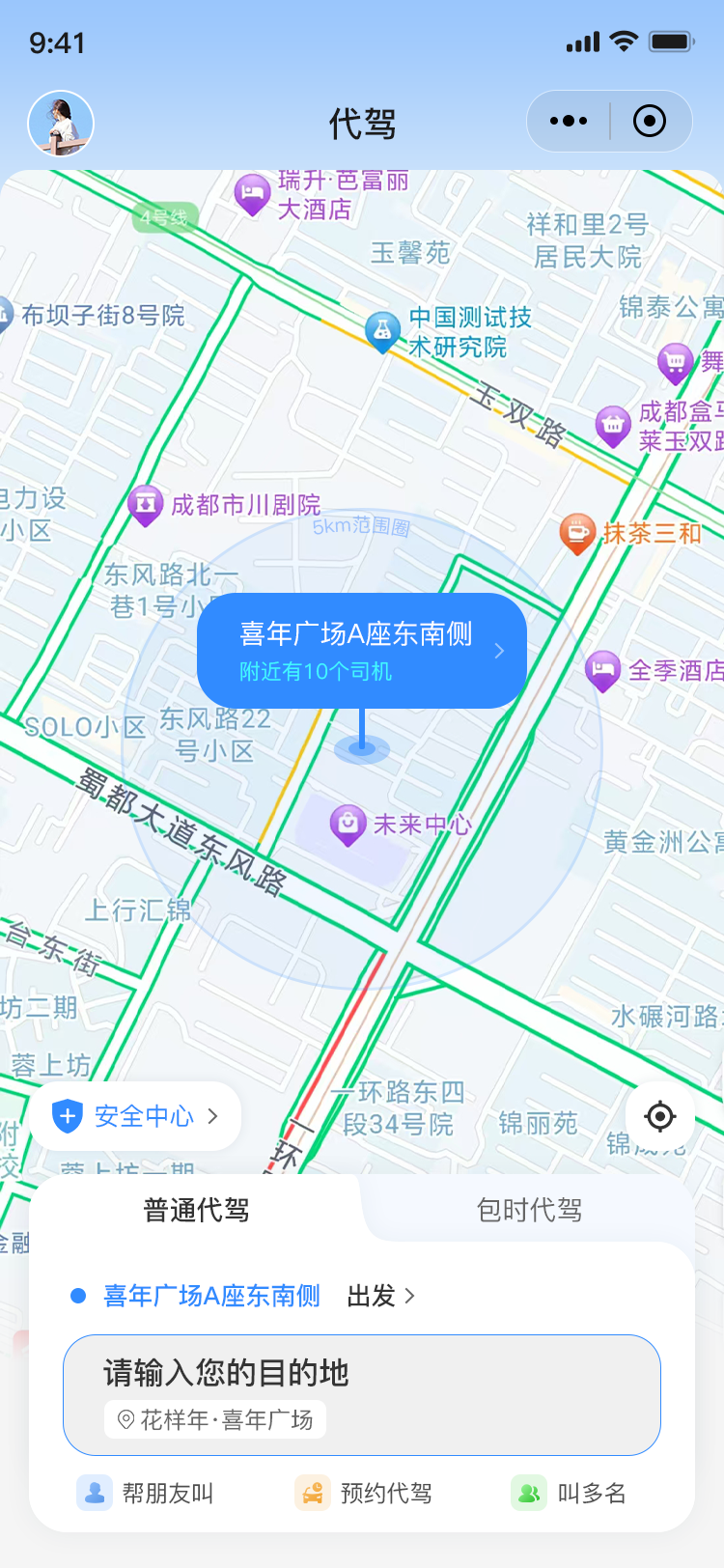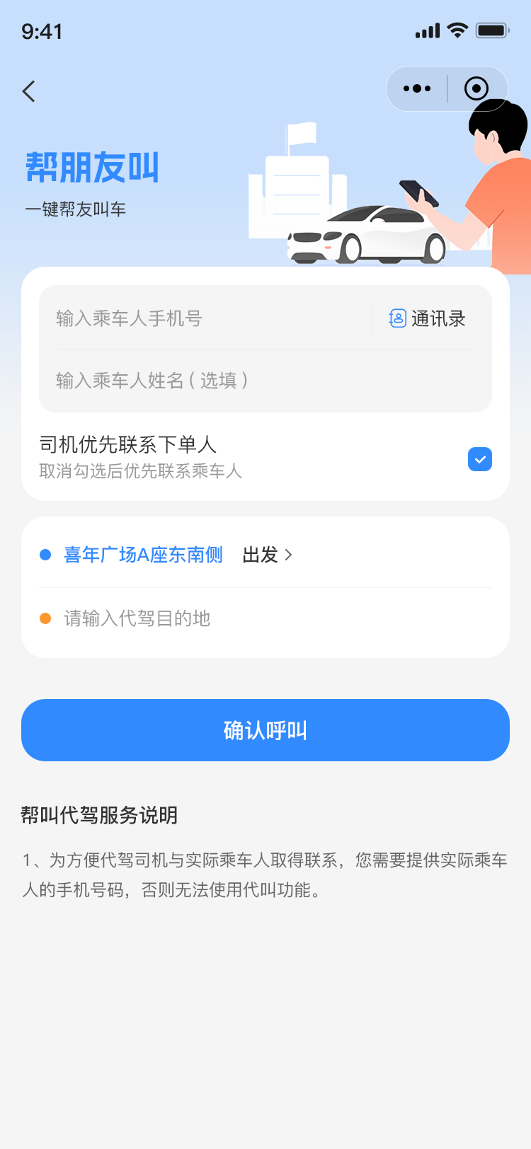 2. 一键下单:选择上车地点和目的地,一键下单,同时可以实时追踪代驾司机的位置,了解司机的行驶路线和预计到达时间等信息。