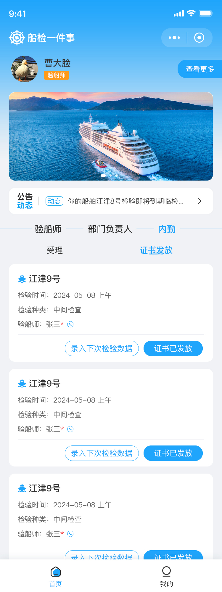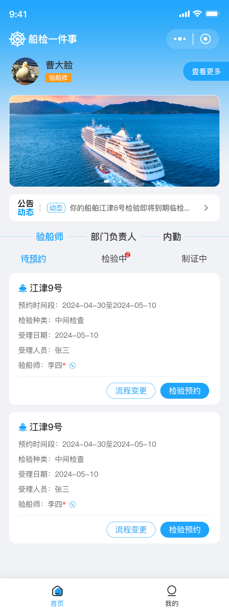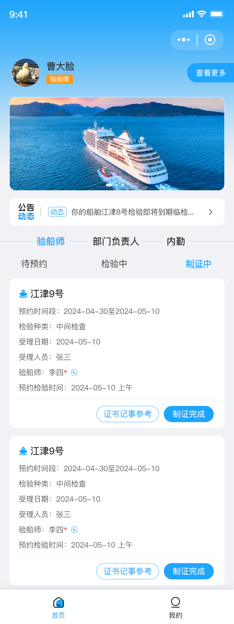 3、检验信息一键推送:检验中船舶,检验流程节点信息自动推送,如验船师指派情况、检验预约时间、发证领取等信息。