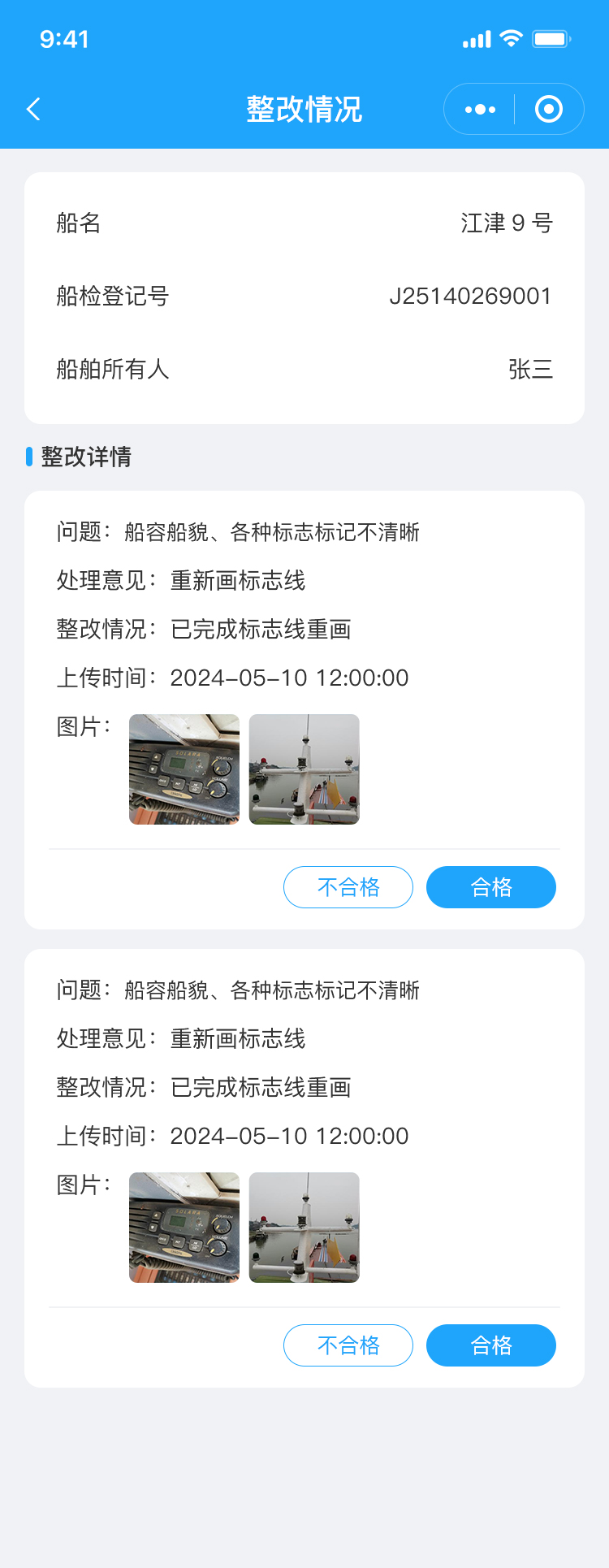 9、船舶缺陷整改上报:船东通过微信小程序端或PC端以文字、图片、视频等形式上报船舶整改情况。