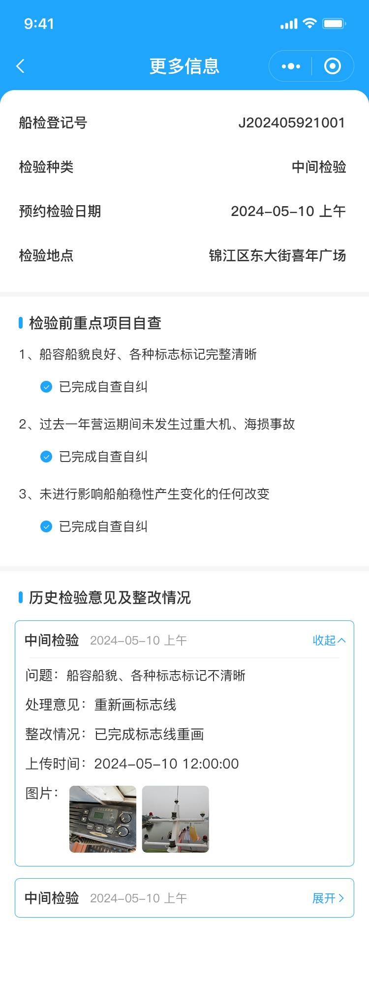 8、重点船舶检验前船东自查:对重点船舶要求船东在验船师开展现场检验前开展自查自纠,并通过微信小程序端或PC端进行确认。